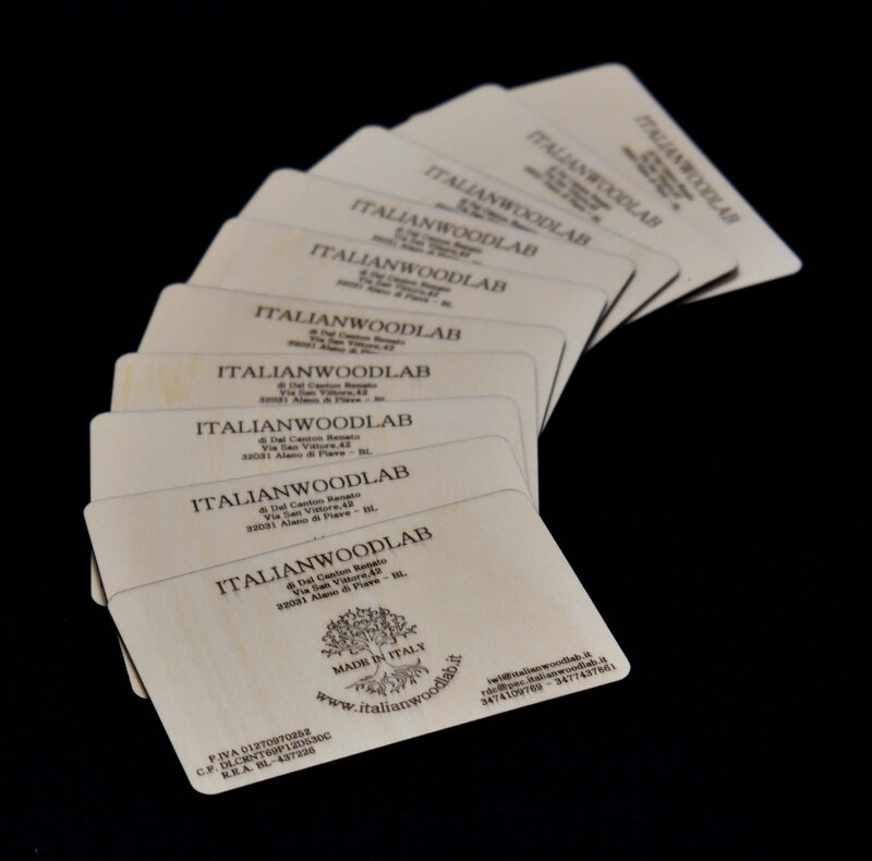 Biglietti da visita personalizzati, color legno naturale, ricavati da multistrato di pioppo di 1,5 mm di spessore, lavorati mediante incisione e taglio laser, rifinitura manuale