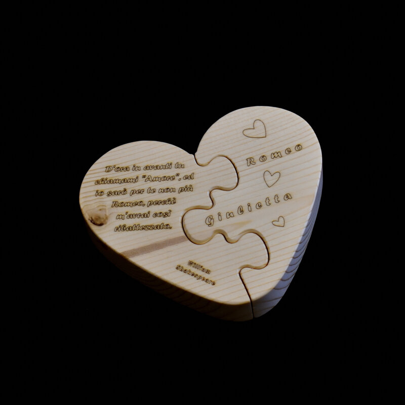 Cuore in due pezzi ad incastro tipo puzzle, ricavato da tavole di legno di abete di 24 mm di spessore, lavorato mediante fresatura cnc, incisioni laser, rifinitura manuale,