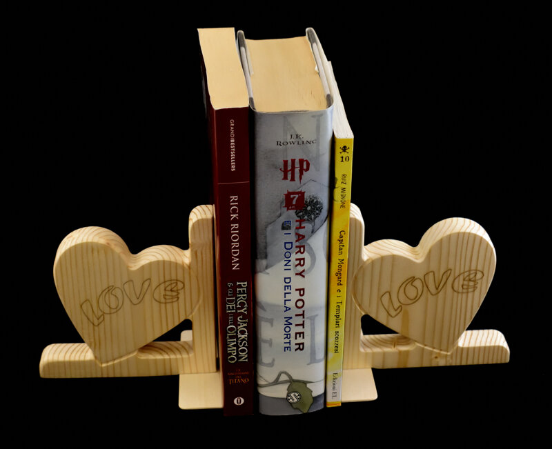 Coppia di fermalibri color legno naturale È ricavata da tavole di legno di abete da 21 mm di spessore lavorato mediante fresatura cnc, è dotato di una sottile e solida base in legno per garantirne la stabilità. Incisioni laser, rifinitura manuale e finitura esterna semilucida con cera d’api.