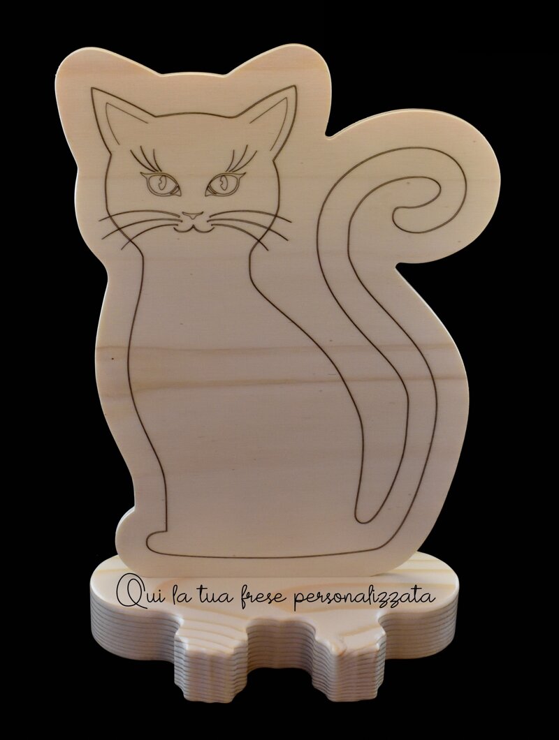 4 mm (per la sagoma). Lavorato mediante fresatura cnc, incisioni laser, rifinitura manuale, finitura esterna semilucida con cera d’api. Sotto la base una